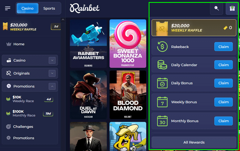 - Visit Promotions Page: All active bonuses are listed on the Rainbet promotions section.